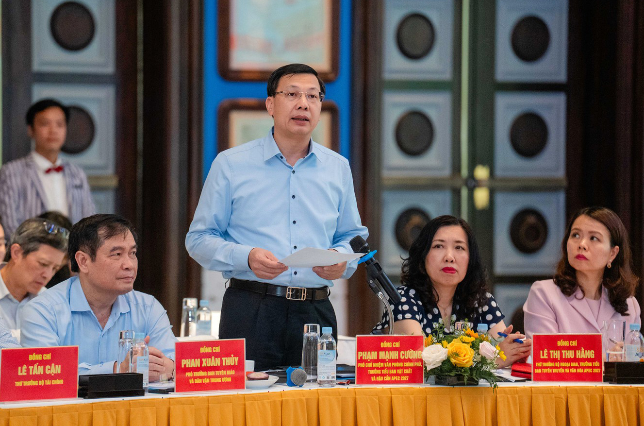Trưởng Tiểu ban Vật chất và Hậu cần APEC, Phó Chủ nhiệm Văn phòng Chính phủ Phạm Mạnh Cường phát biểu tại cuộc họp.