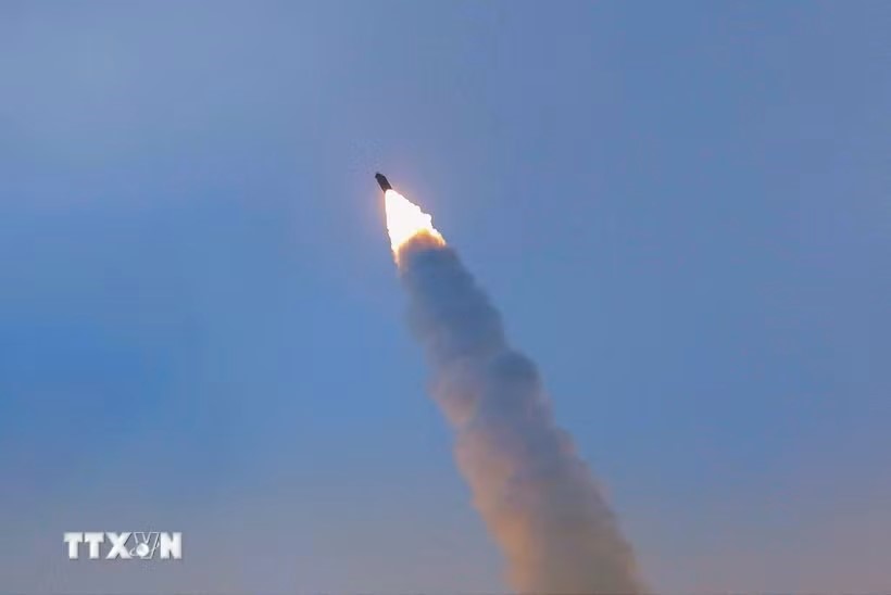 Cuộc tập trận phóng tên lửa siêu vượt âm tại Bình Nhưỡng, Triều Tiên, ngày 4/1/2026. (Nguồn: Yonhap/TTXVN)