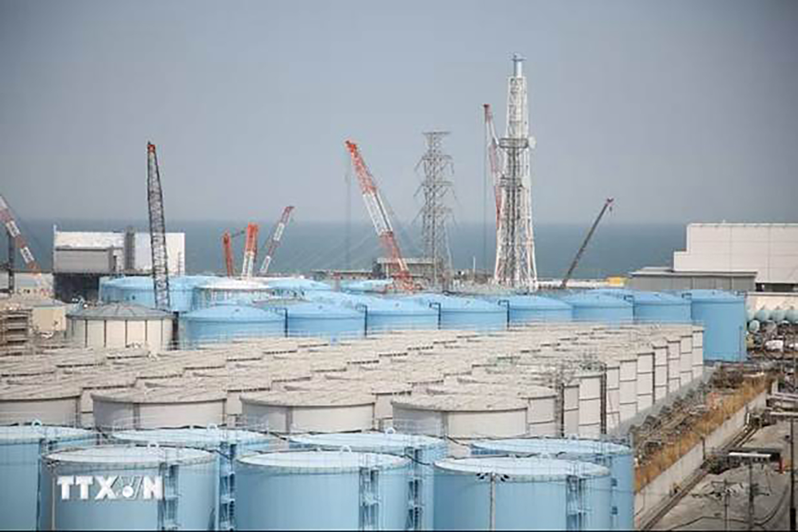 Các bể chứa nước thải nhiễm xạ tại nhà máy điện hạt nhân Fukushima Daiichi ở Okuma, tỉnh Fukushima, Nhật Bản. (Ảnh: Kyodo/TTXVN)