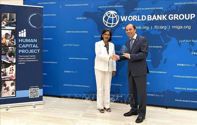 Phó Chủ tịch WB phụ trách về nguồn lực con người trao danh hiệu quốc gia có thành tích tốt nhất về HCI+ trong nhóm các nước có cùng mức thu nhập cho Đại sứ Việt Nam tại Mỹ Nguyễn Quốc Dũng. Ảnh: TTXVN