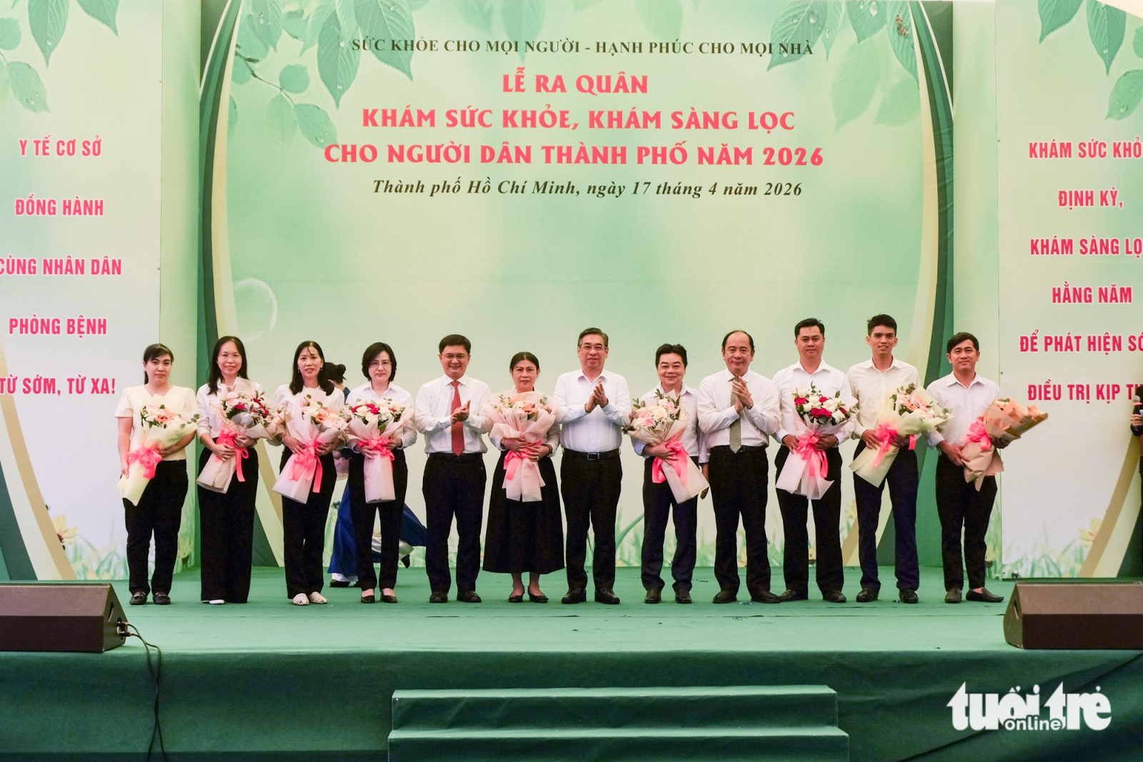 Phó bí thư Thành ủy, Chủ tịch Ủy ban Mặt trận Tổ quốc Việt Nam TP. Hồ Chí Minh Nguyễn Phước Lộc, Phó chủ tịch UBND TP. Hồ Chí Minh Nguyễn Mạnh Cường, Giám đốc Sở Y tế TP. Hồ Chí Minh Tăng Chí Thượng trao hoa chúc mừng và động viên giám đốc 10 trạm y tế - Ảnh: Phương Nhi/Tuổi Trẻ