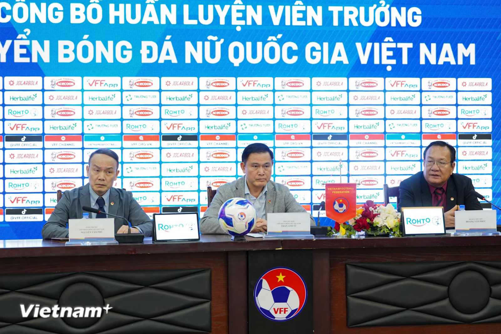 Liên đoàn VFF kỳ vọng huấn luyện viên Hoàng Văn Phúc (phải) sẽ cùng đội tuyển Nữ Việt Nam phát huy các thành tích đã đạt được, góp phần nâng tầm vị thế bóng đá Nữ Việt Nam trên đấu trường khu vực và châu lục. Ảnh: Việt Anh/Vietnam+