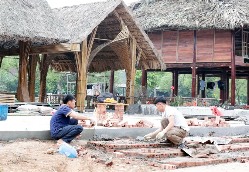 Xây dựng không gian hội trại văn hóa Đền Hùng 2026. (Ảnh: Tạ Toàn/TTXVN)