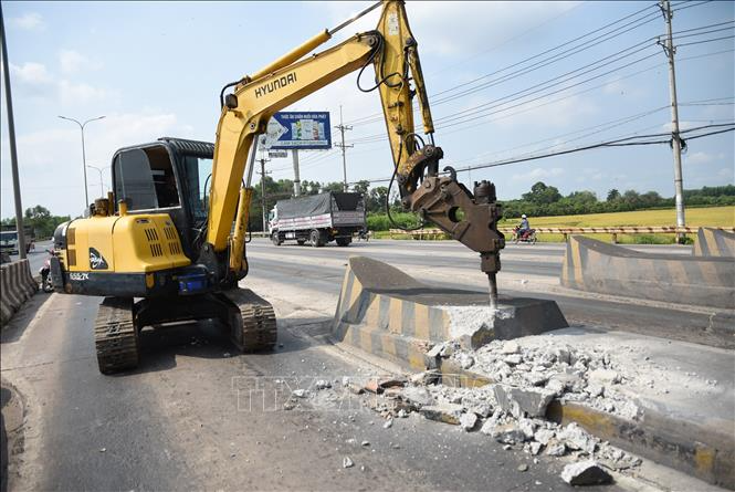 Máy móc, nhân lực phá bỏ các kết cấu tại Trạm Thu phí T2 trên Quốc lộ 51, đoạn qua Đồng Nai. Ảnh: Báo Tin Tức