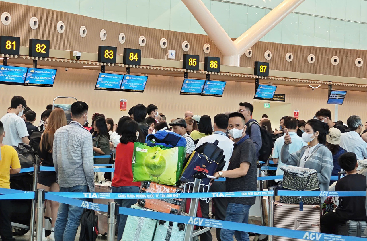 Hành khách làm thủ tục tại sân bay Tân Sơn Nhất, TP.HCM trước kỳ nghỉ lễ 30/4 và 1/5 - Ảnh: Công Trung/Tuổi Trẻ