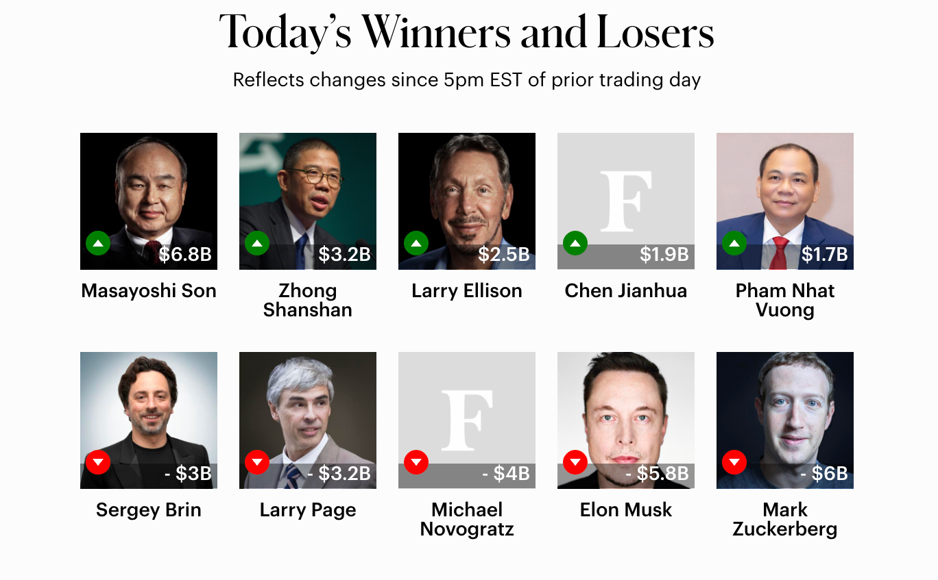 Bảng xếp hạng những tỉ phú có tài sản tăng mạnh nhất và giảm mạnh nhất trong ngày 21-4 (cập nhật tới 13h).