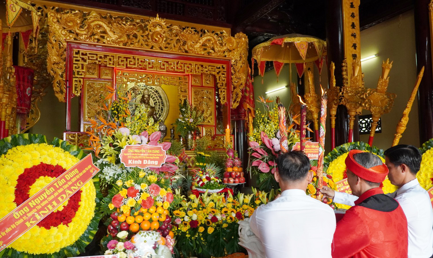 Mở đầu chương trình lễ dâng hương, đồng chí Bùi Ngọc Sương thực hiện nghi thức đánh trống khai lễ. Tiếp đó, Chủ tịch UBND xã Tân Hiệp Lê Thanh Hùng cùng đoàn dâng lễ vật tiến vào chánh điện, dâng vòng hoa mang dòng chữ “Đời đời nhớ ơn các Vua Hùng đã có công dựng nước”, thành kính dâng hương, dâng lễ vật lên các Vua Hùng.