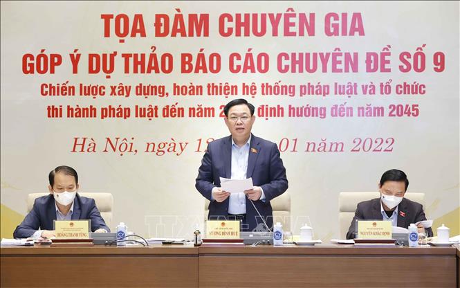 Chiều 12-1, tại Nhà Quốc hội, đồng chí Vương Đình Huệ, Ủy viên Bộ Chính trị, Bí thư Đảng đoàn, Chủ tịch Quốc hội, Trưởng Ban Chỉ đạo, Trưởng Tiểu ban số 1 chủ trì Toạ đàm chuyên gia góp ý Dự thảo báo cáo chuyên đề số 9 “Chiến lược xây dựng, hoàn thiện hệ thống pháp luật và tổ chức thi hành pháp luật đáp ứng yêu cầu xây dựng, hoàn thiện Nhà nước pháp quyền XHCN Việt Nam đến năm 2030, định hướng đến năm 2045”.