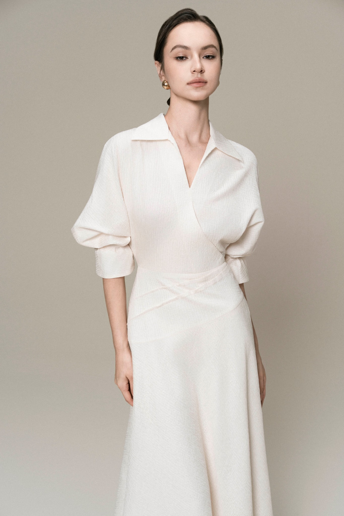 Sức hút từ mẫu váy dài màu cream nằm ở sự kỳ công qua việc cắt vải xéo, đường xếp nếp mềm mại nơi eo tạo độ xòe tự nhiên cho trang phục. Một chiếc váy midi cổ chữ V với phần cổ áo bẻ nửa sau vừa đủ chuyên nghiệp, lịch thiệp mà vẫn đầy quyến rũ. ẢNH: L’ALLÉE
