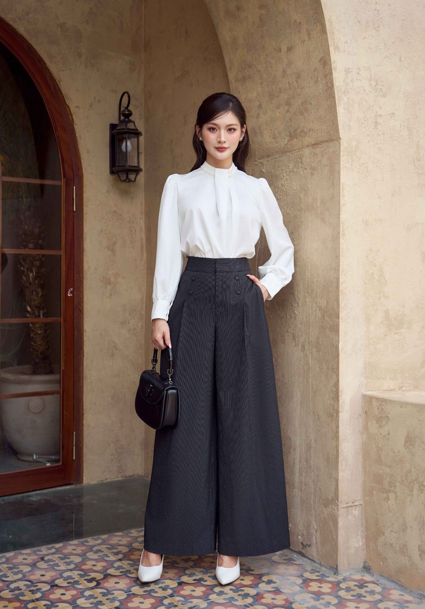 Quần với họa tiết kẻ dọc tinh tế làm nổi bật đường nét cơ thể, thiết kế ống rộng giúp che khuyết điểm đôi chân. Khi kết hợp cùng áo sơ mi trắng cổ đứng và phụ kiện tối giản, tổng thể mang đến khí chất tự tin chuẩn quý cô văn phòng.