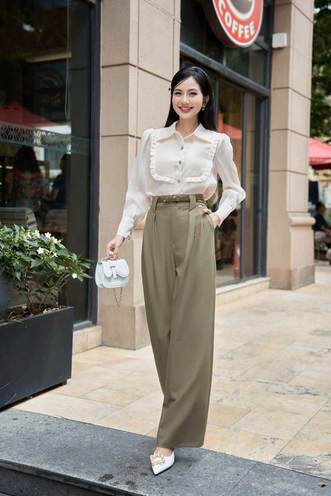 Thu hút mọi ánh nhìn khi bước xuống phố với dáng quần suông màu ô liu nhẹ nhàng mà sang trọng. ẢNH: LAMIA