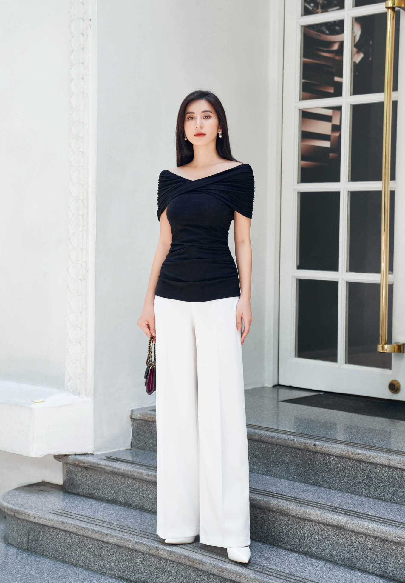 Quần suông kết hợp áo trễ vai tôn nét gợi cảm tinh tế