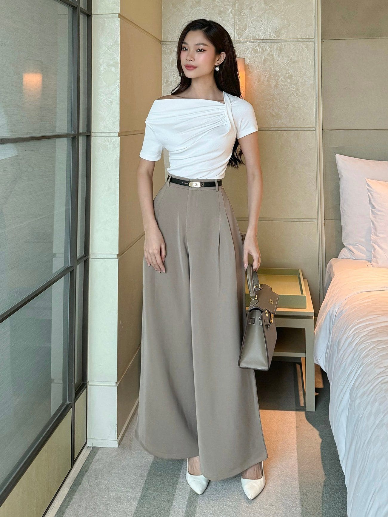 Bản phối tone sur tone hài hòa với quần suông màu kem phối cùng áo trễ vai đồng tông. ẢNH: @SPEARL