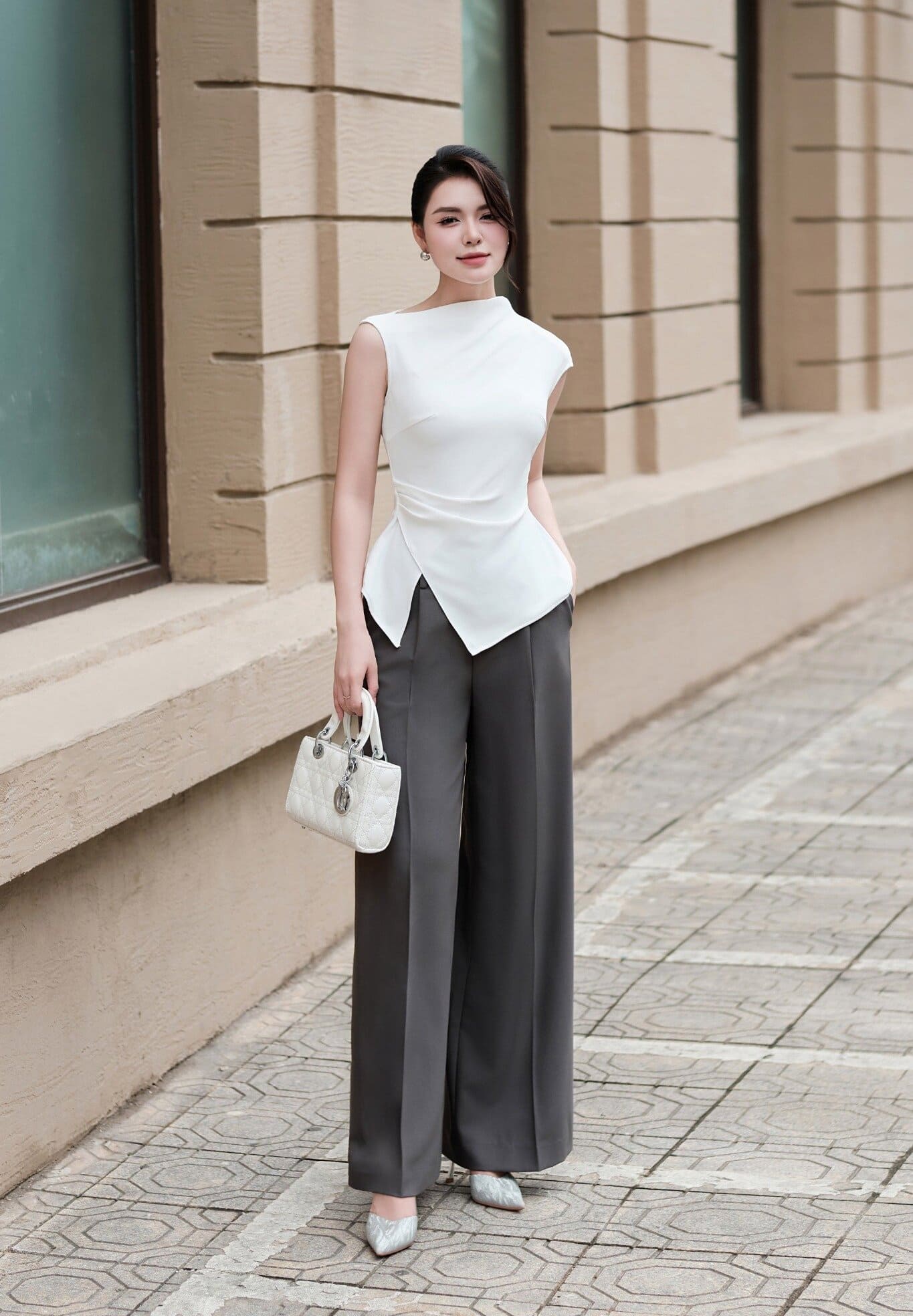 Chiếc quần suông trắng dài chấm gót được cắt may chuẩn mực, phom ống rộng và chất vải dày mịn giữ phom đứng dáng, tôn lên vòng eo nhỏ nhắn cho người diện. ẢNH: @CEVONNI