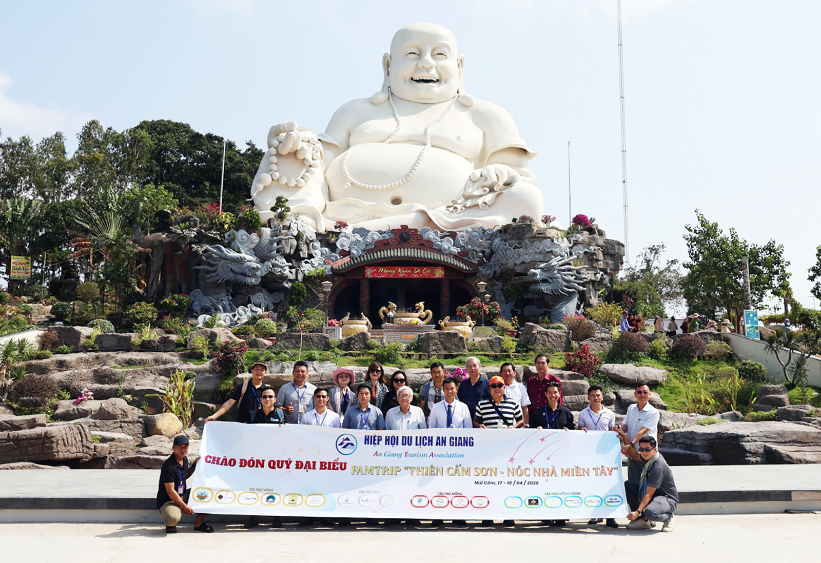 Đại biểu chụp ảnh lưu niệm tại tượng Phật Di Lặc.