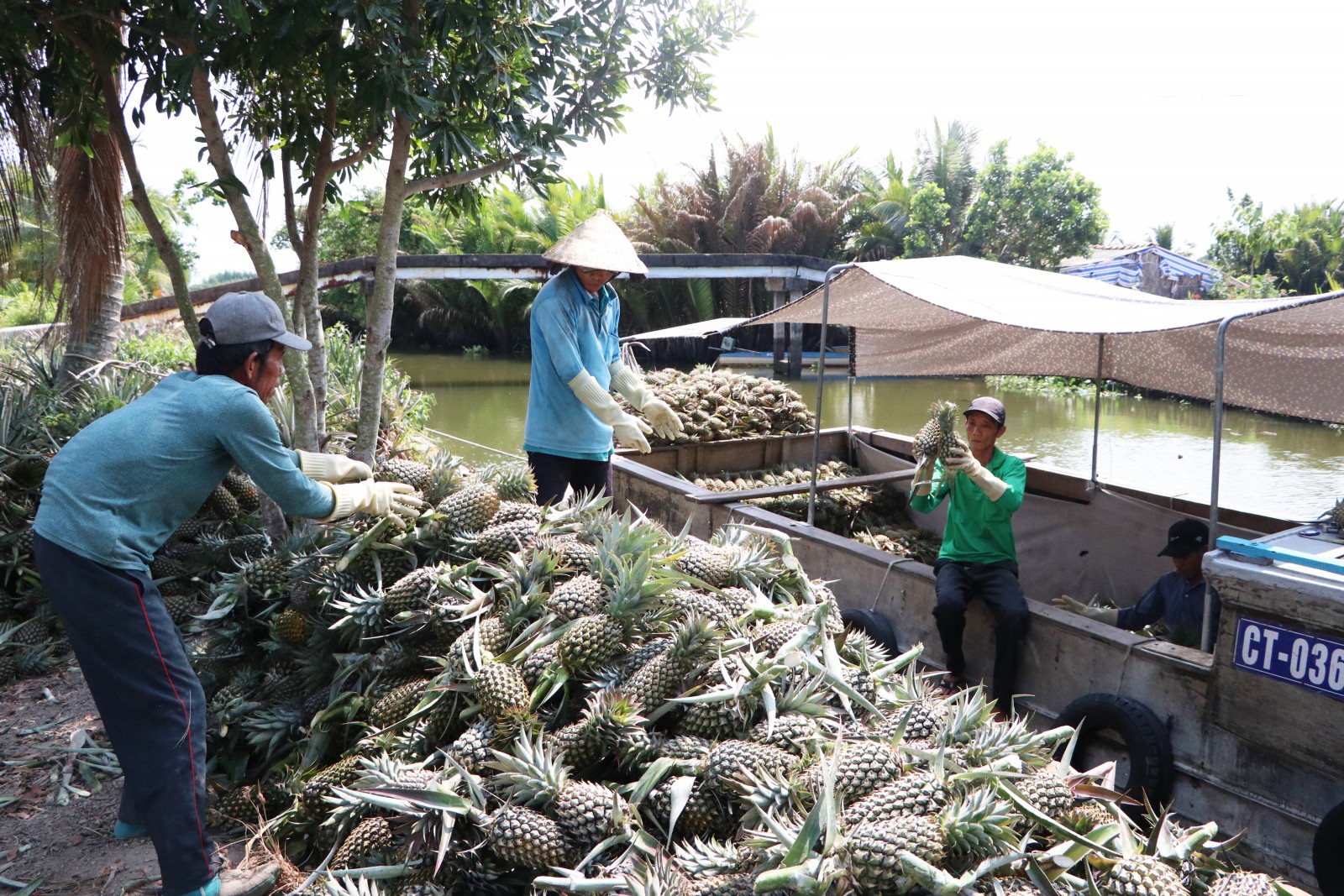 Người dân ấp Phước Bình thu hoạch khóm. Ảnh: TIỂU ĐIỀN