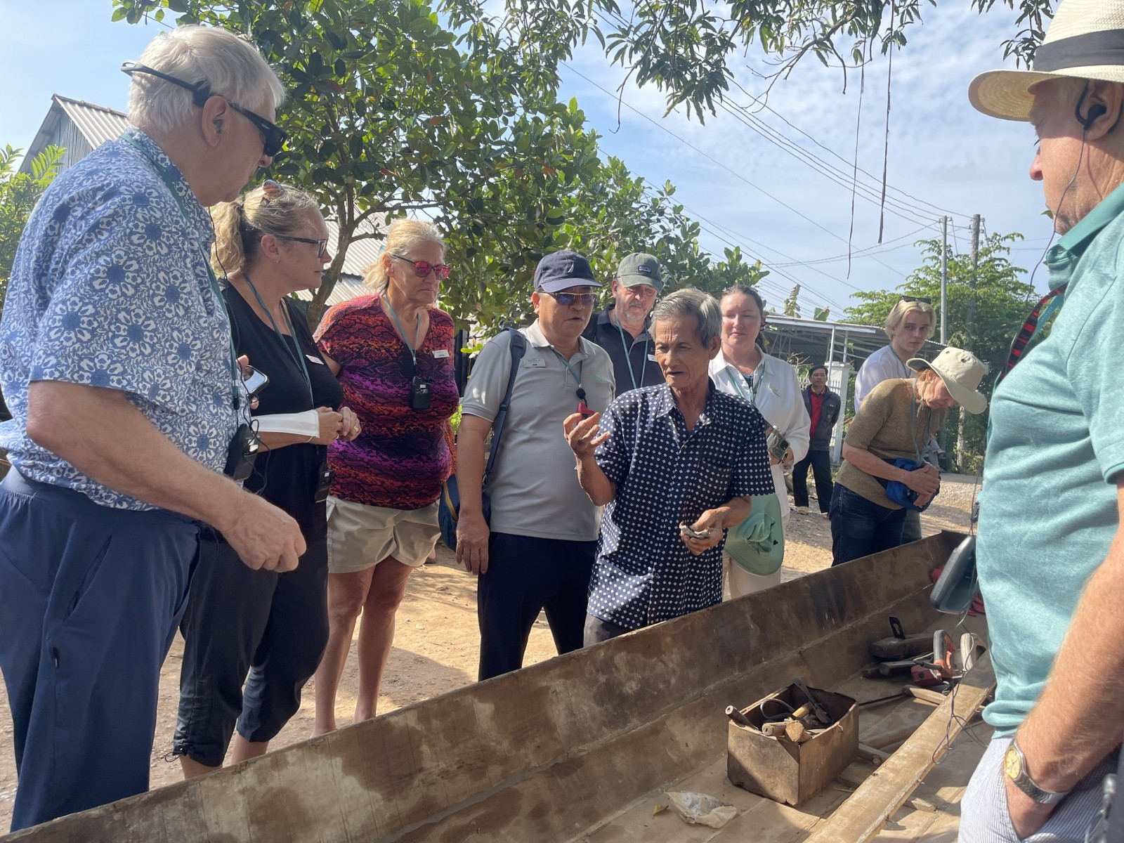 Du khách tìm hiểu về nghề đóng ghe xuồng truyền thống.
