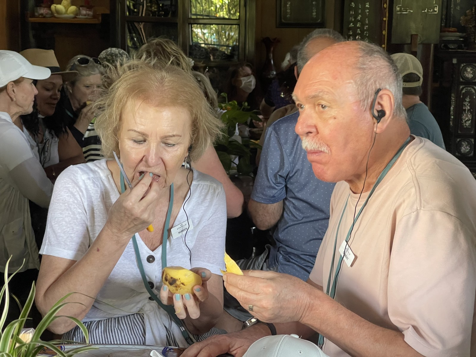Khách du lịch thưởng thức xoài đặc sản tại điểm tham quan nhà cổ trăm năm.