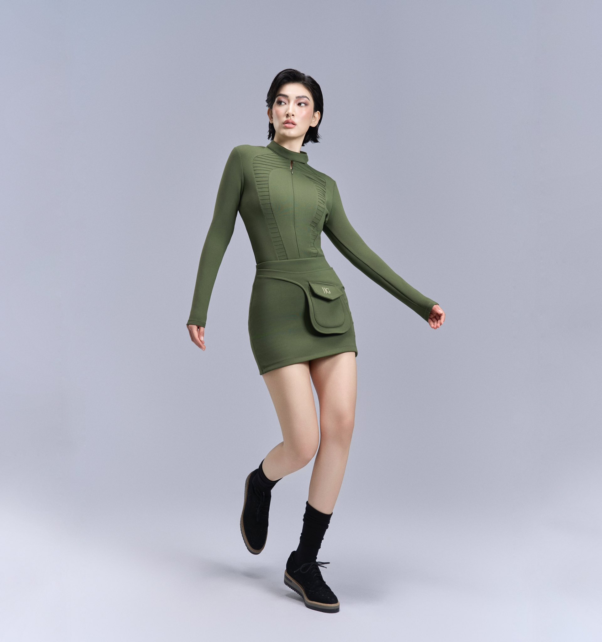 Tông xanh rêu tạo cảm giác khỏe khoắn, trong khi chi tiết túi đeo liền thân tăng tính ứng dụng cho các hoạt động ngoài trời. Kết hợp cùng giày thể thao và tất cao, tổng thể hoàn thiện vẻ năng động. ẢNH: JAMES JOYCE GOLF
