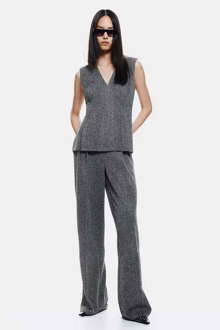 Áo cổ chữ V không tay và quần suông xám mang tinh thần “power dressing”, biểu tượng của người phụ nữ thành thị tự tin, hiện đại. ẢNH: H&M