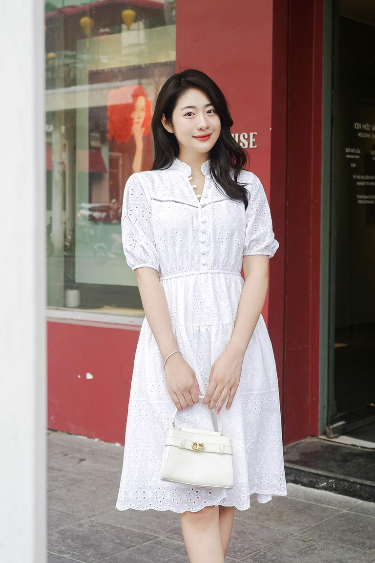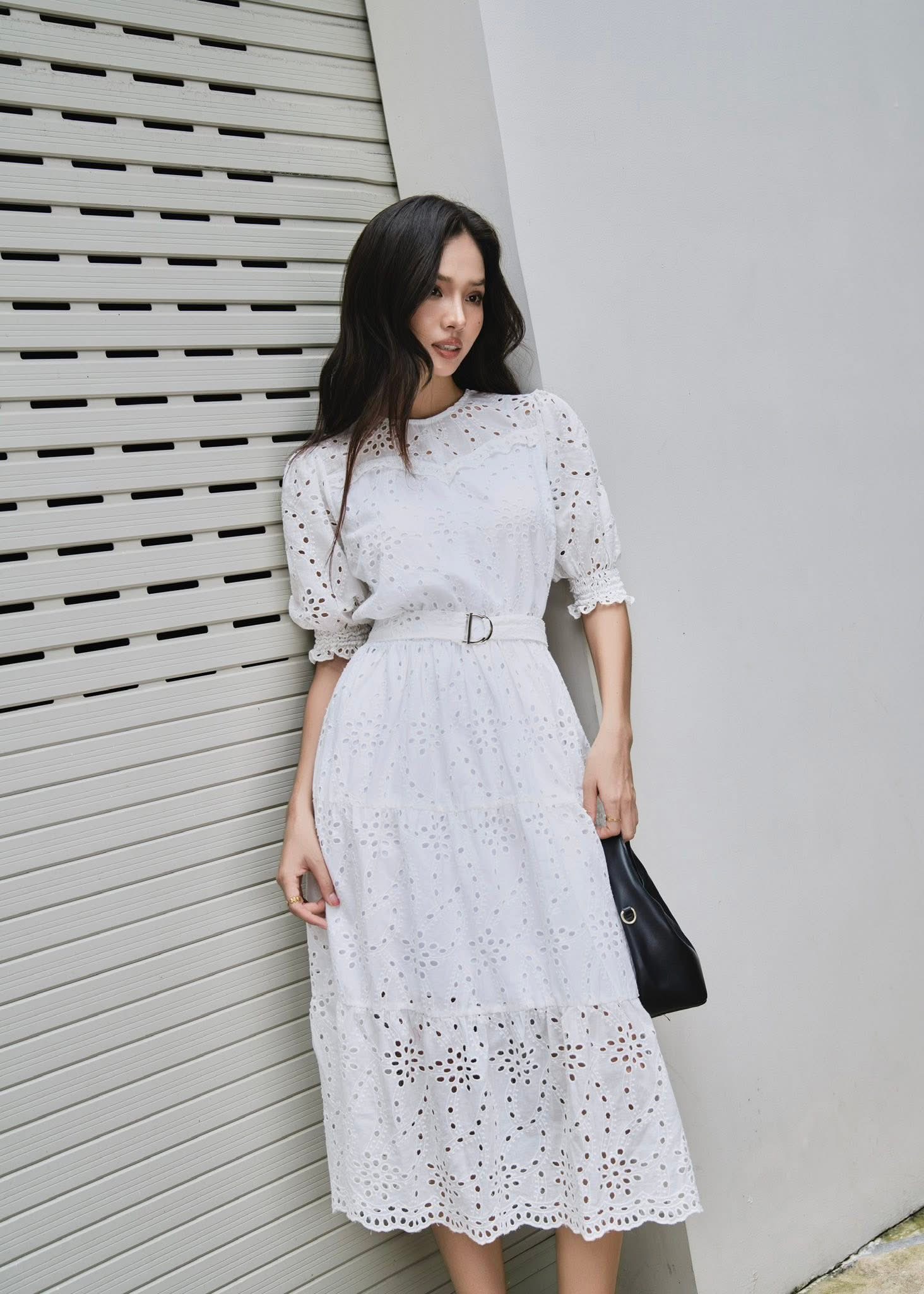 Chọn cho mình một chiếc đầm midi màu trắng, nổi bật với chi tiết đục lỗ hoa văn lớn và nhỏ đan xen như những hình bông tuyết trên toàn bộ thân váy và tay áo ngắn phồng. Chiếc đầm có dáng dài quá gối, cổ tròn và được nhấn eo bằng một chiếc thắt lưng vải cùng màu với khóa kim loại.