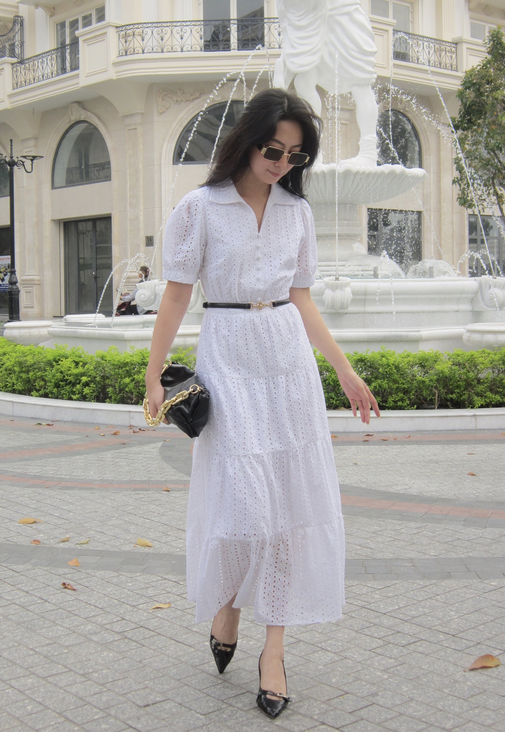 Cho những buổi dạo chơi chiều, nàng có thể chọn chiếc đầm maxi trắng họa tiết đục lỗ li ti xếp tầng tinh tế. Cổ sơ mi và thắt lưng da mỏng màu đen tạo điểm nhấn rõ ràng cho vòng eo, mang lại tổng thể cân đối và thời thượng.