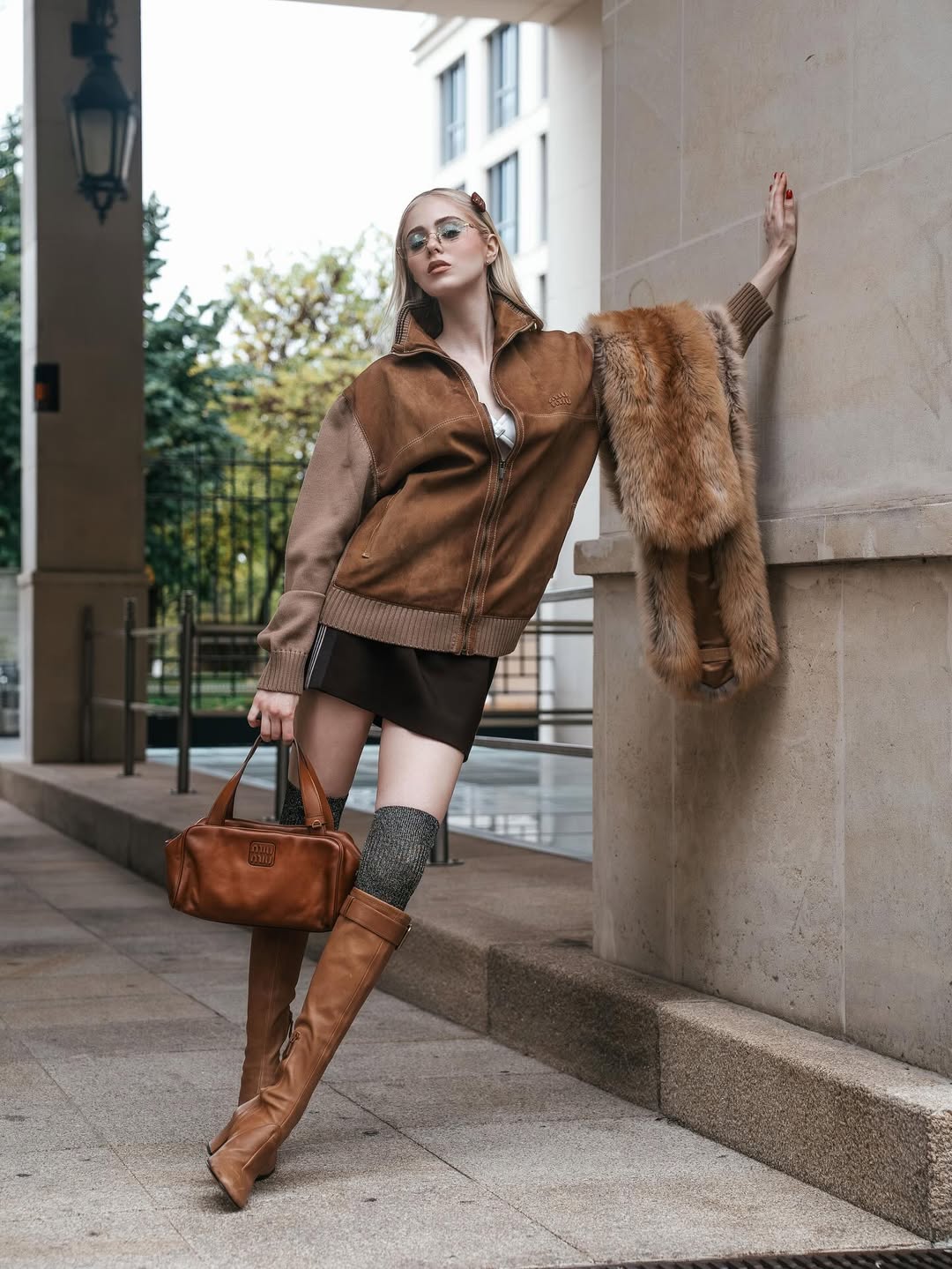 Fashionista Loretope Rallta tại show diễn của Miu Miu với đôi bốt ôm cùng váy ngắn và áo khoác da lộn trong Tuần lễ thời trang Paris, tháng 10.2025. ẢNH: @LORETOPERALTA