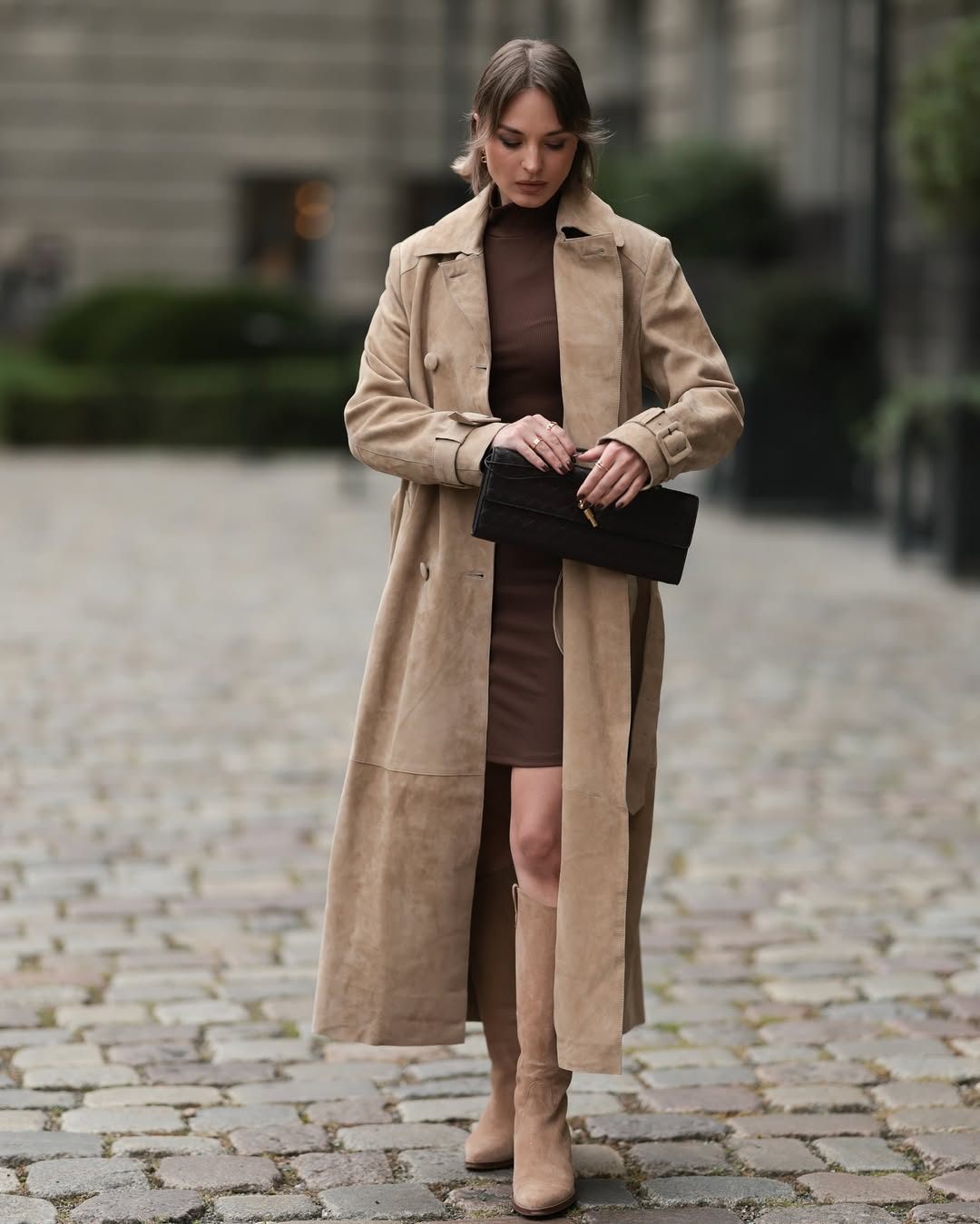 Yana Pries diện áo khoác trench coat dài bằng da lộn màu be ấm áp tone sur tone cùng đôi bốt cao. ẢNH: @YANA PRIES