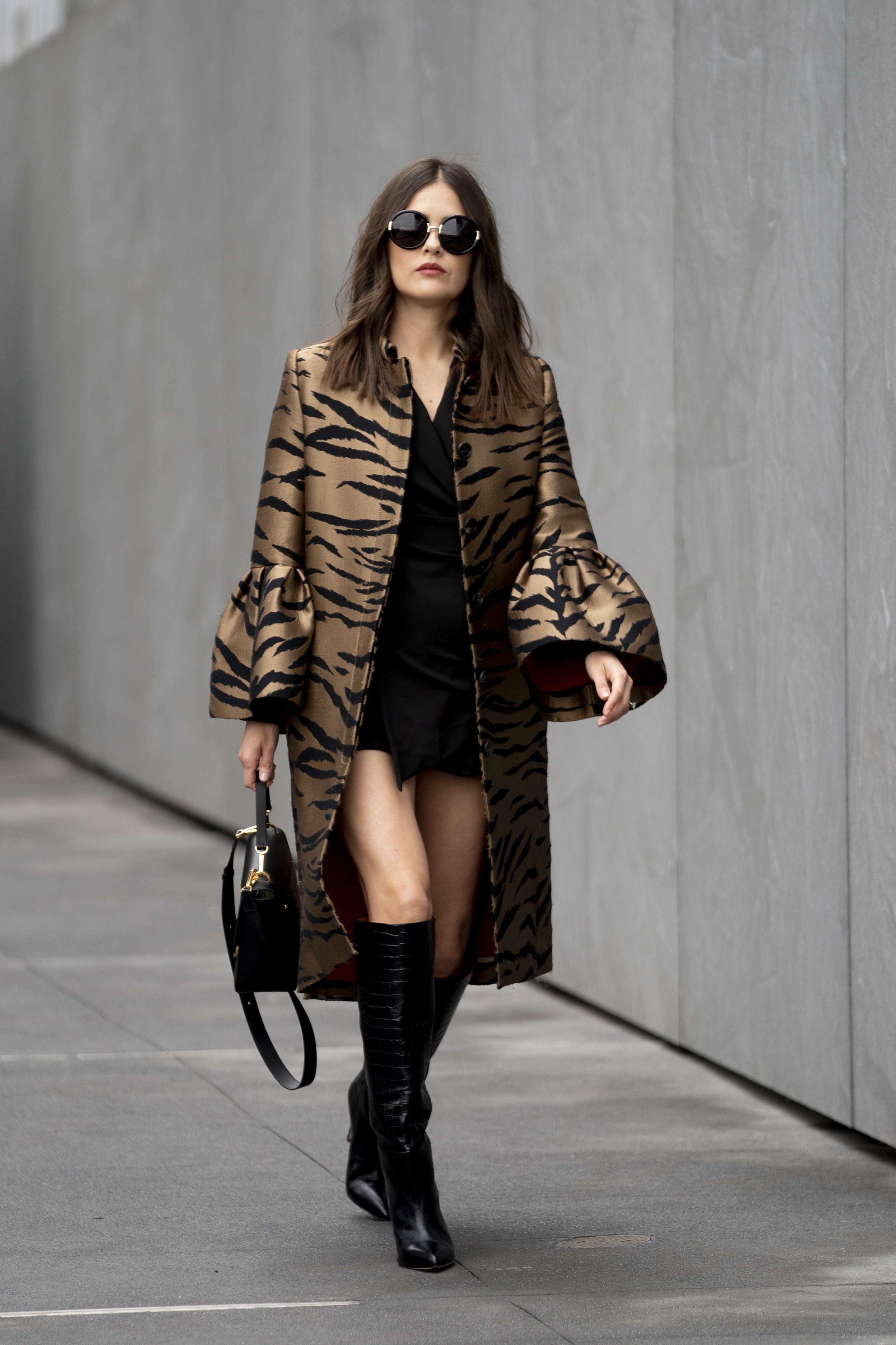 Áo khoác họa tiết kết hợp váy ngắn và bốt cao, bộ ba quyền lực giúp phái đẹp toát lên vẻ sang trọng, tự tin và đầy khí chất trên mọi con phố mùa thu. ẢNH: @NYSTYLE