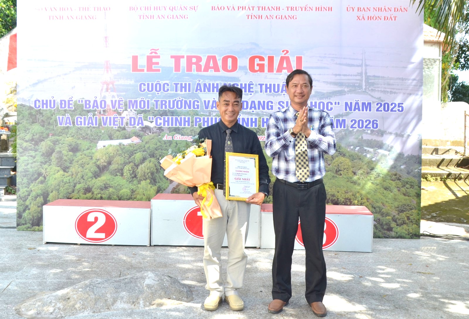 Phó Giám đốc phụ trách Báo và Phát thanh - Truyền hình tỉnh An Giang Lê Văn Chuyển trao giải nhất cho tác giả Nguyễn Hoàng Nam.
