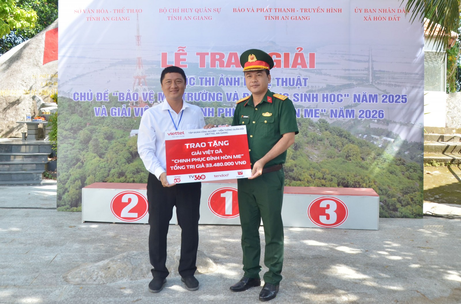 Đại điện Tập đoàn Công nghiệp - Viễn thông Quân đội Viettel An Giang trao bảng tượng trưng tài trợ Giải Việt dã “Chinh phục đỉnh Hòn Me” tỉnh An Giang năm 2026 với số tiền 33.480.000 đồng.