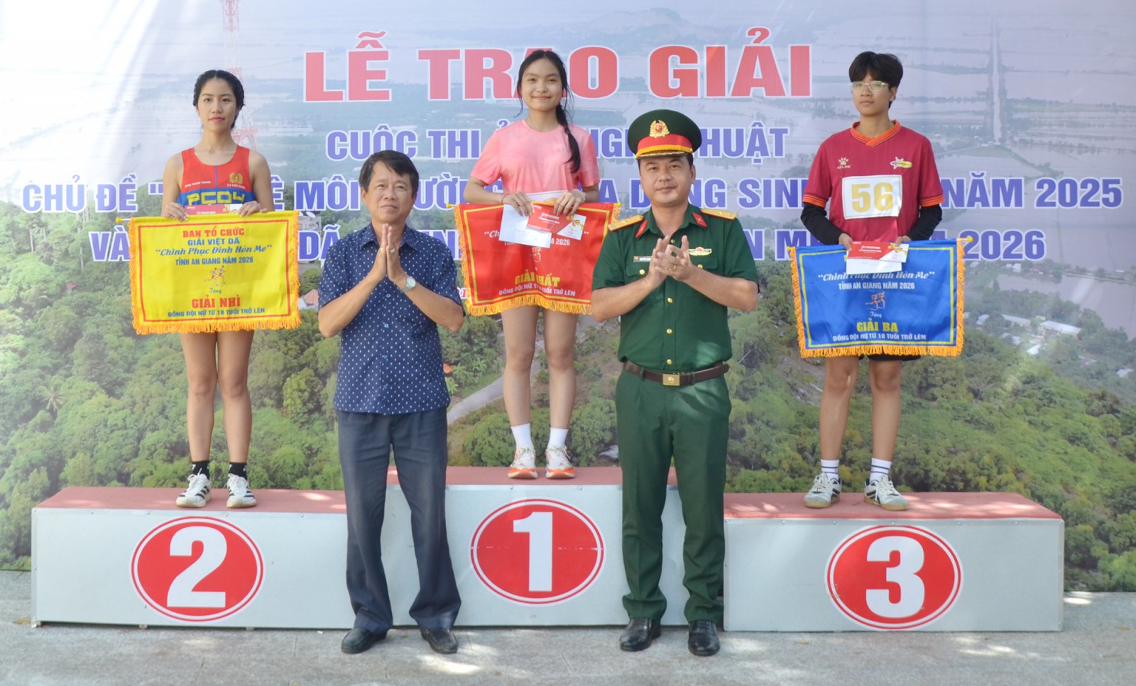 Phó Giám đốc phụ trách Báo và Phát thanh - Truyền hình tỉnh An Giang Lê Văn Chuyển (hàng trước, bìa trái); Thượng tá Phan Thanh Phong (hàng trước, bìa phải), Phó Tham mưu trưởng Bộ Chỉ huy Quân sự tỉnh An Giang trao giải cho các vận động viên thi đấu cự ly nam 3km.