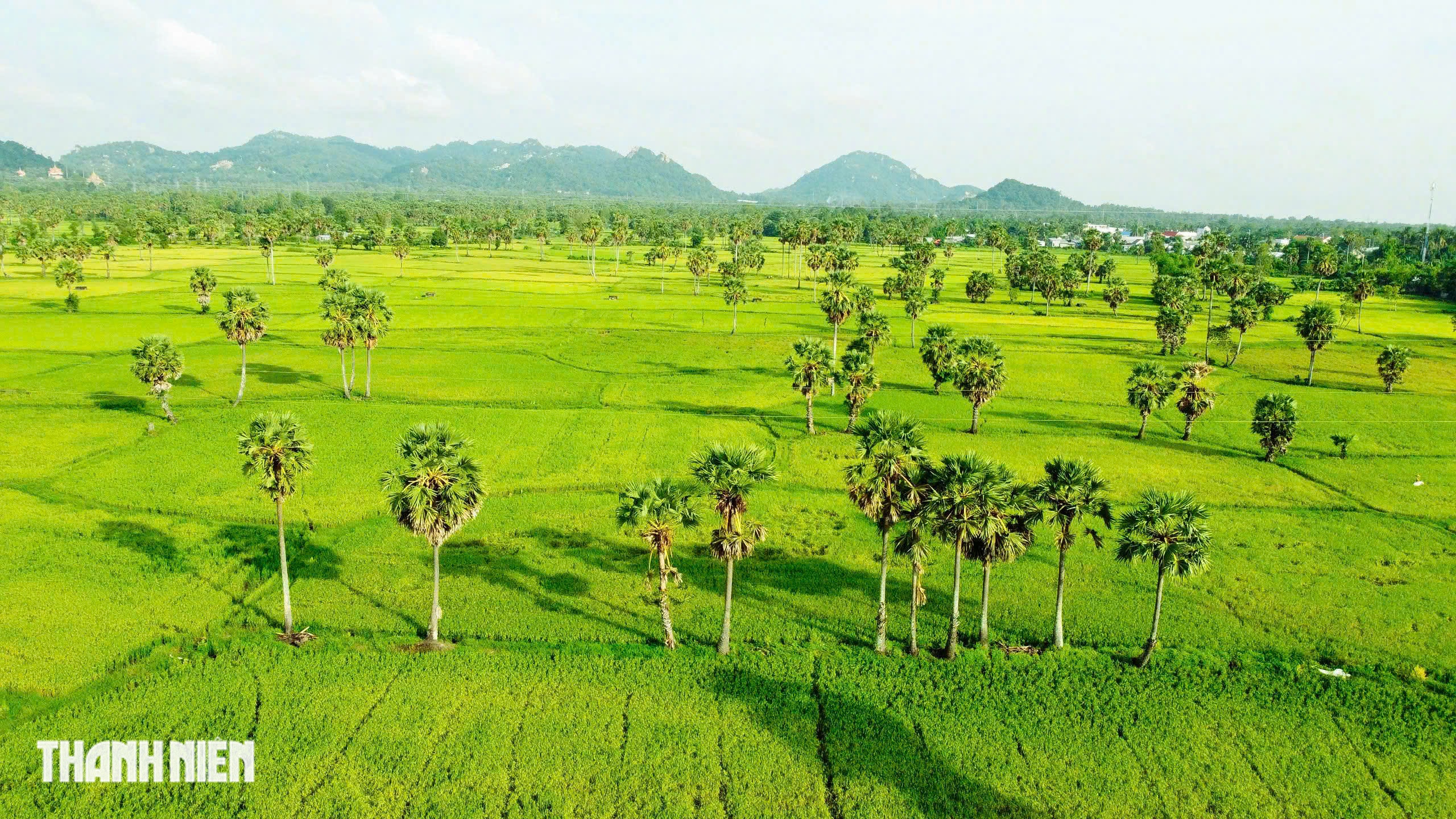Cánh đồng thốt nốt cũng là biểu tượng của vùng đất này. Những thân cây cao vút, dáng đứng mạnh mẽ giữa trời, hòa cùng sắc lúa và gió đồng, góp phần tạo nên vẻ đẹp khó có nơi nào có được. ẢNH: THANH QUÂN