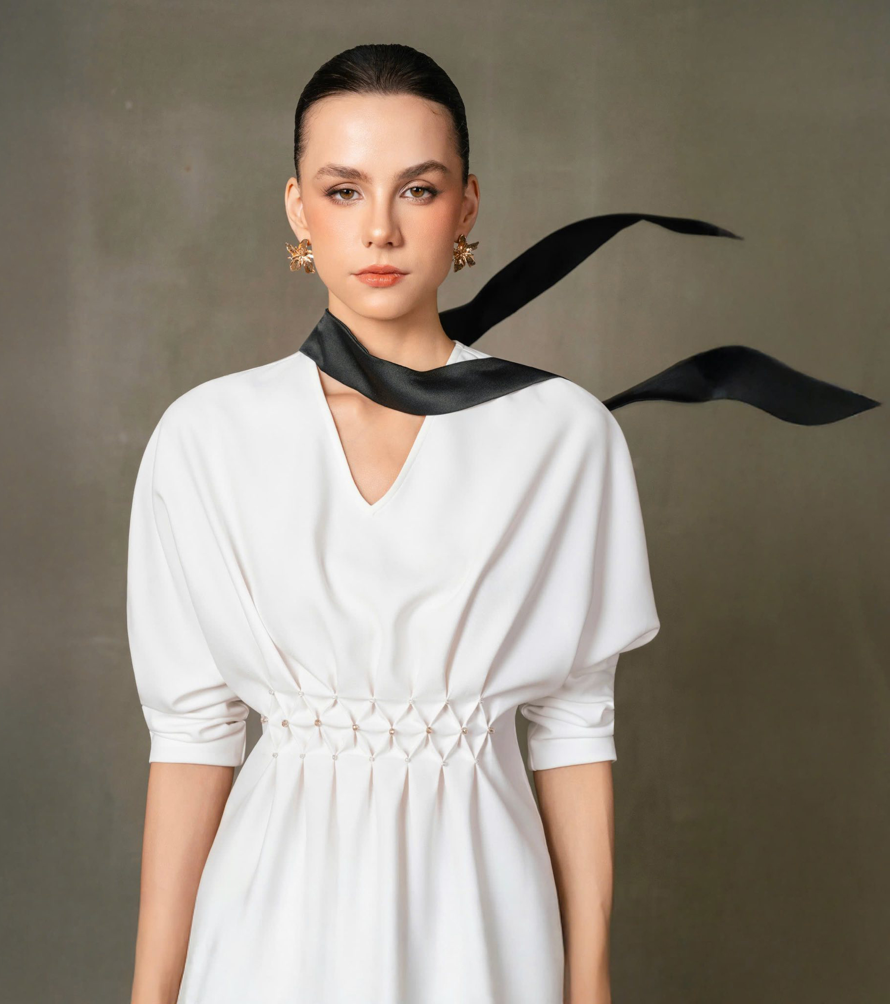 Một chiếc váy trắng tối giản, hiện đại qua chi tiết drapping nơi eo đủ sức giúp nàng trở nên nổi bật và cuốn hút. Phụ kiện thời trang, giày hoặc túi, trang sức có thể chọn phối khác màu để tạo thêm điểm nhấn cho bản phối. ẢNH: GRAPHE