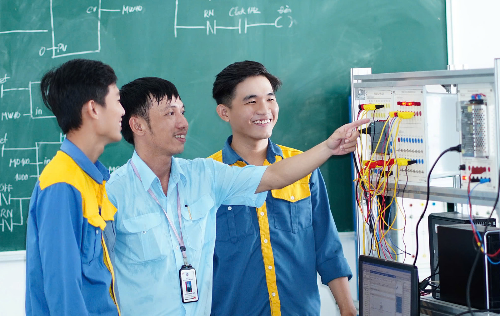 Thầy Hồ Minh Nhất Bảo (giữa) - giảng viên Khoa Điện - Điện tử Trường Cao đẳng Kiên Giang hướng dẫn sinh viên thực hành.