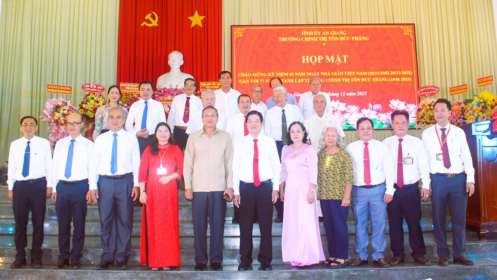 Nguyên Phó Bí thư Thường trực Tỉnh ủy, nguyên Chủ tịch HĐND tỉnh An Giang Lê Văn Nưng (thứ 5, từ trái sang) chụp ảnh lưu niệm cùng các đại biểu tham dự Lễ kỷ niệm 43 năm Ngày Nhà giáo Việt Nam và 77 năm thành lập trường.
