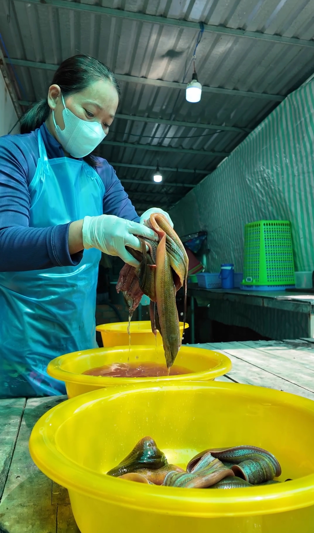 Nhân công sơ chế lươn để làm khô. Ảnh: BẢO TRÂN