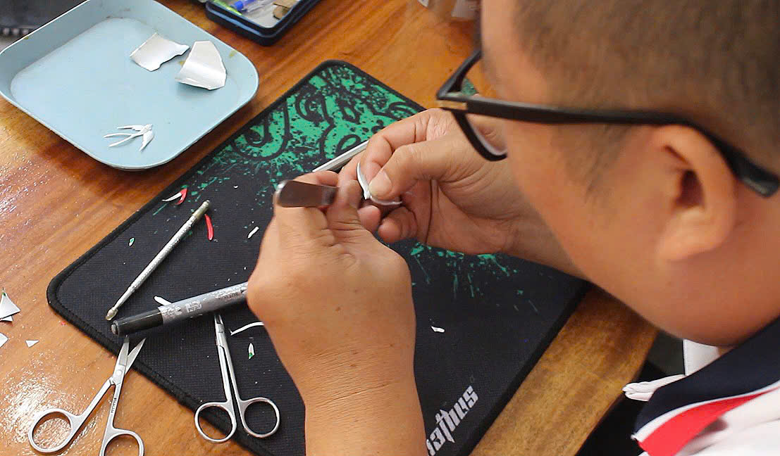 Điểm đặc biệt của anh còn nằm ở bộ dụng cụ làm tranh. Thời gian đầu, tay anh đầy vết cắt vì lưỡi lam thô sơ. Từ những dụng cụ đơn giản như bộ làm móng tay của vợ, kéo y tế, anh đã tự chế và biến thành trợ thủ đắc lực. "Quan trọng không phải dụng cụ đắt tiền, mà là hiểu chất liệu và biết cách làm chủ công cụ," anh nhấn mạnh.