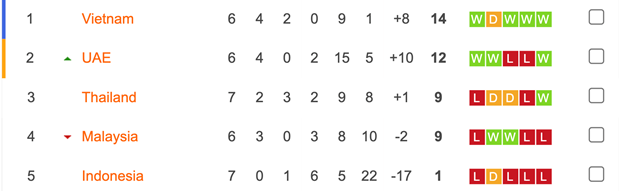 Đội tuyển Việt Nam vẫn duy trì vị trí đầu bảng G vòng loại thứ hai World Cup 2022 khu vực châu Á sau chiến thắng trước Indonesia. Điều này mang lại lợi thế cho đoàn quân huấn luyện Park Hang-seo trong cuộc đua giành tấm vé đi tiếp so với UAE, Thái Lan và Malaysia.
