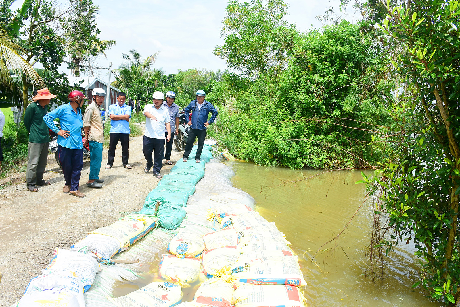 Lãnh đạo Ủy ban nhân dân xã Thạnh Mỹ Tây kiểm tra các điểm gia cố tại các tuyến đê xung yếu. Ảnh: THANH TIẾN