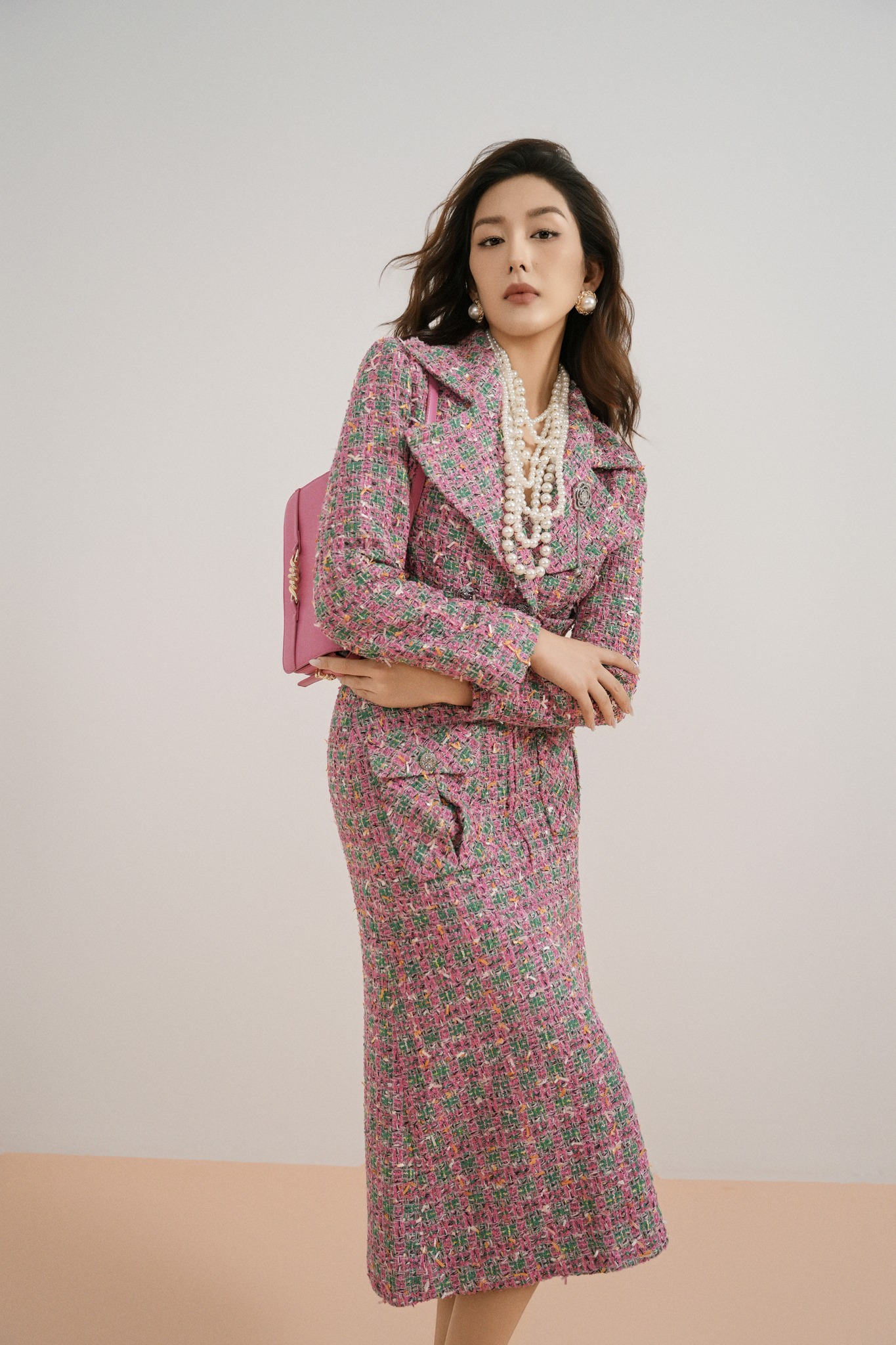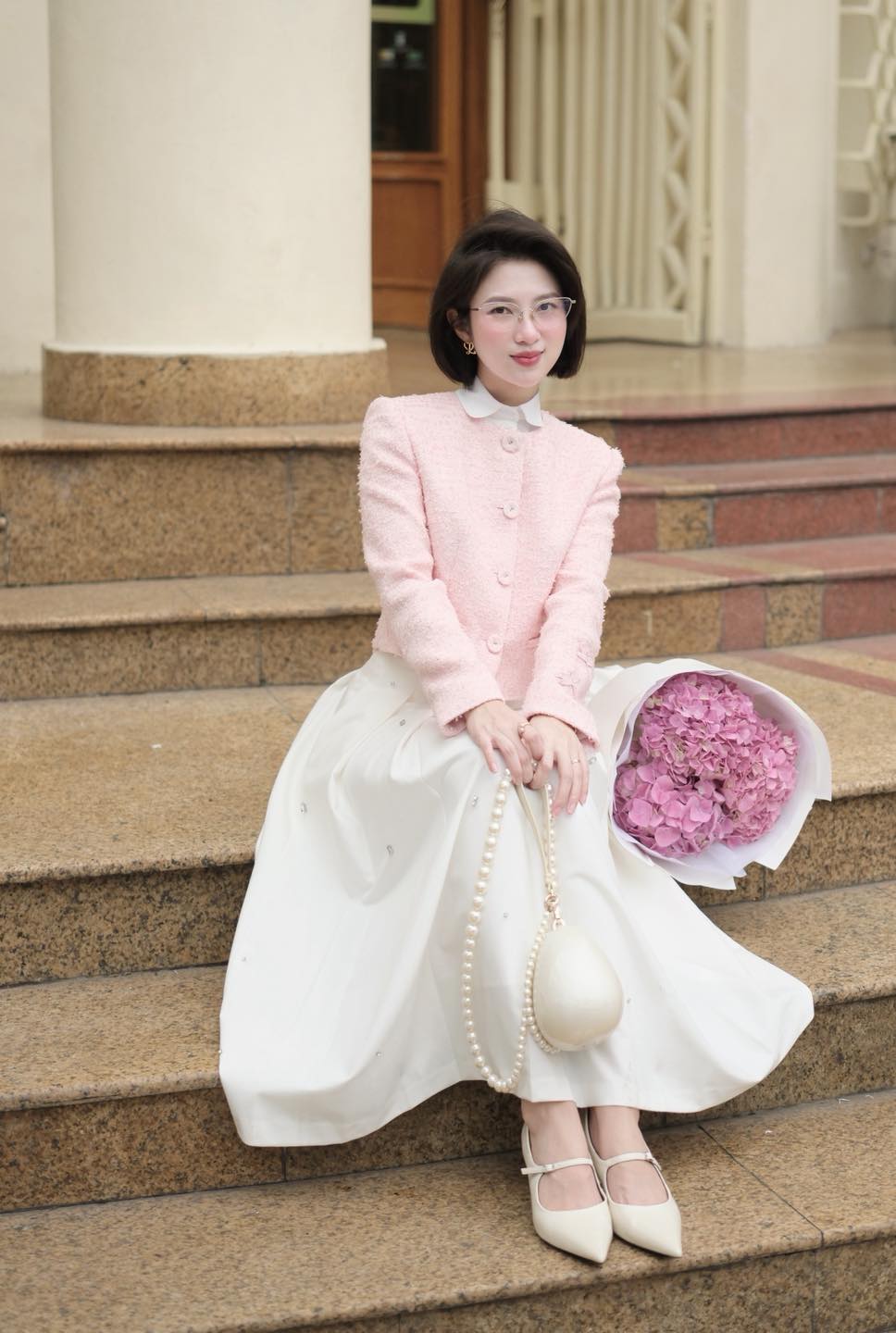 Bộ trang phục mang tinh thần thanh lịch, nữ tính, chuẩn nàng tiểu thư hiện đại. Áo tweed hồng pastel kết hợp chân váy trắng xòe mềm mại giúp tổng thể trở nên dịu dàng, tươi sáng và rất "ăn hình". ẢNH: BOHEE
