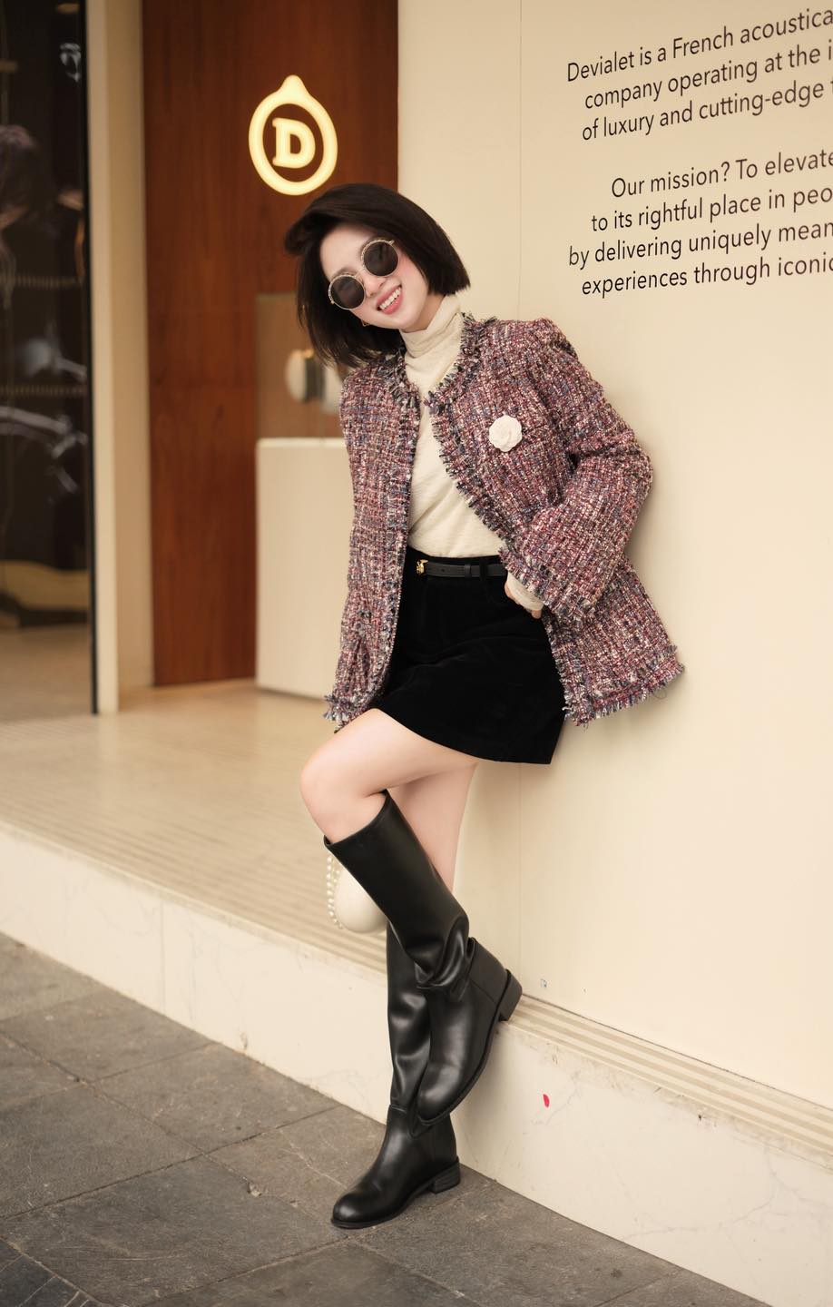 Đây là bản phối quen thuộc vào mùa lạnh. Áo tweed dáng suông được kết hợp với áo cổ lọ, chân váy đen tối giản mang đến vẻ trẻ trung; đôi bốt tạo hiệu ứng chân dài và phù hợp cho mọi dịp. ẢNH: BOHEE
