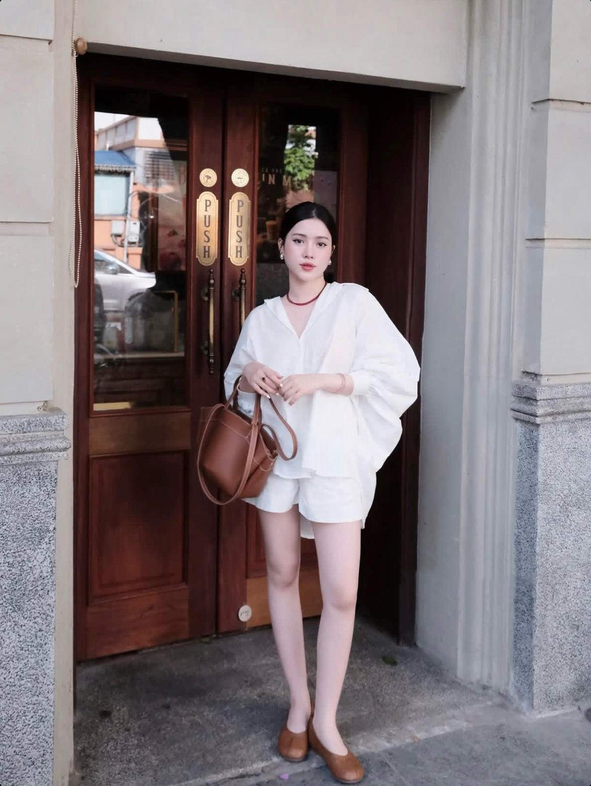 Áo dáng rộng với tay bồng nhẹ tạo nên nét nữ tính mềm mại, trong khi cổ chữ V vừa phải giúp tôn cổ thanh thoát. Quần shorts cùng màu thiết kế tối giản, cân bằng với dáng áo để tổng thể trông hài hòa. Khi kết hợp cùng túi và giày nâu caramel, set đồ gợi cảm giác sang trọng mà vẫn rất tự nhiên.