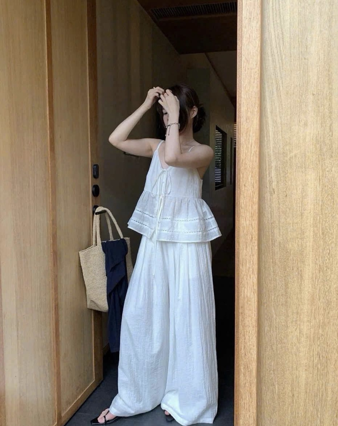 Một gợi ý bay bổng hơn chính là set đồ đũi trắng gồm áo hai dây dáng babydoll và quần ống rộng. ẢNH: @NHACUALINH.STORE