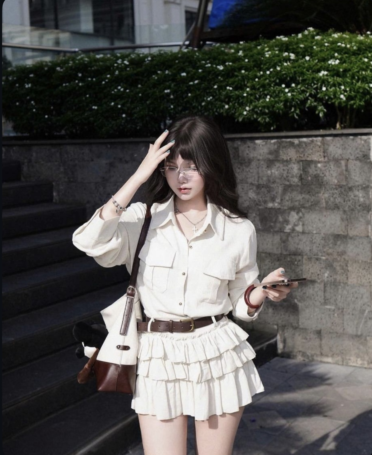 Set váy đũi màu kem sữa mang vẻ tinh khôi, áo dáng sơ mi thanh lịch với hai túi hộp tạo điểm nhấn, trong khi chân váy xếp tầng bồng nhẹ giúp từng bước đi trở nên duyên dáng hơn. Thắt lưng nâu tạo điểm nhấn cho vòng eo, định hình tỷ lệ cơ thể và khiến tổng thể trở nên sang trọng. Kết hợp cùng túi da hoặc phụ kiện tối giản, bản phối gợi cảm giác ngọt ngào mà vẫn thời thượng.