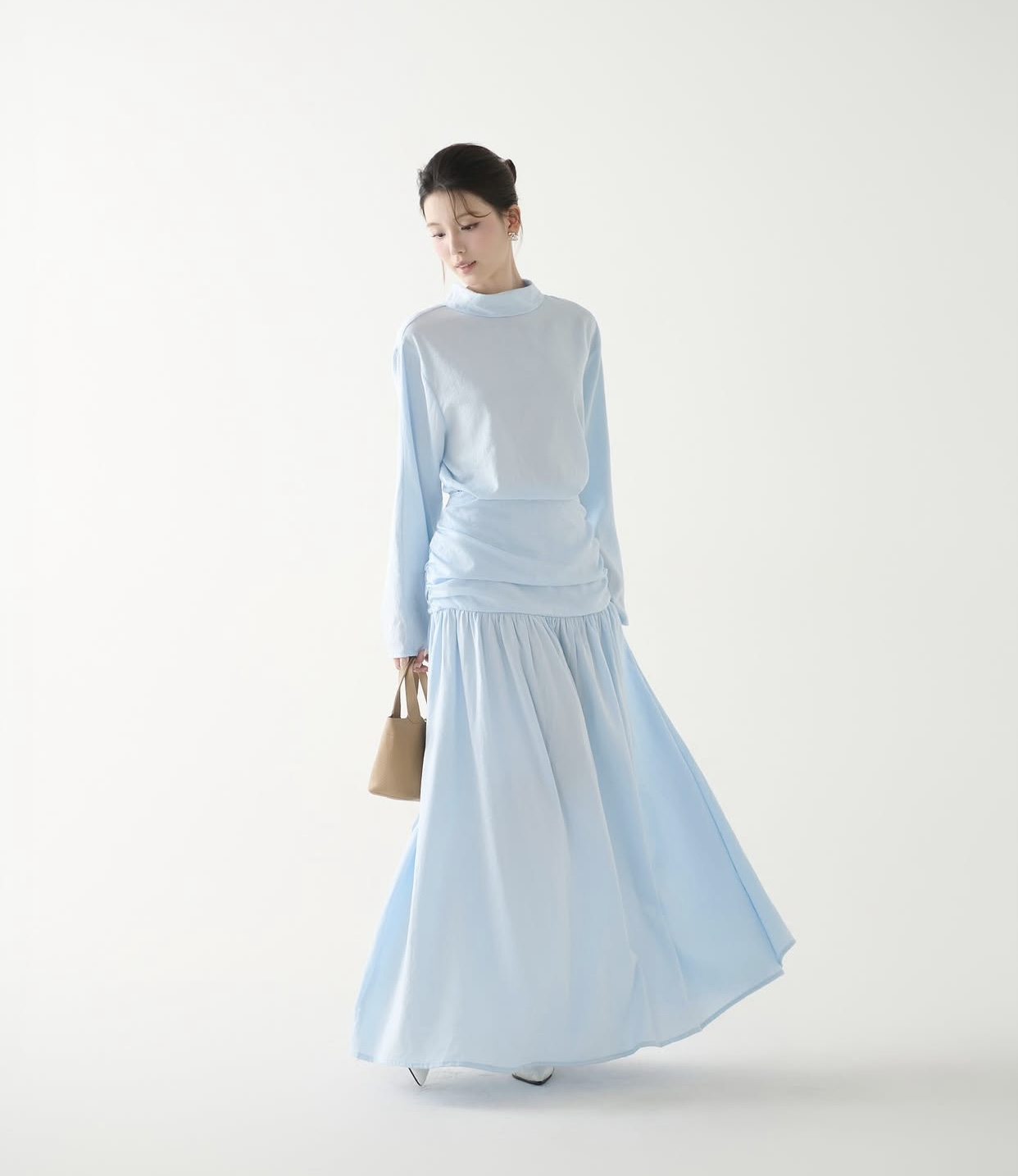 Thiết kế áo dài tay cổ tròn kín đáo, phần chiết nhẹ ở eo tôn dáng khéo léo. Chân váy dài xòe rủ theo chuyển động, chất vải đũi gân mềm mại giúp nàng thoải mái suốt ngày dài. Đây là bản phối lý tưởng cho môi trường công sở, buổi cà phê nhẹ hoặc gặp gỡ bạn bè.