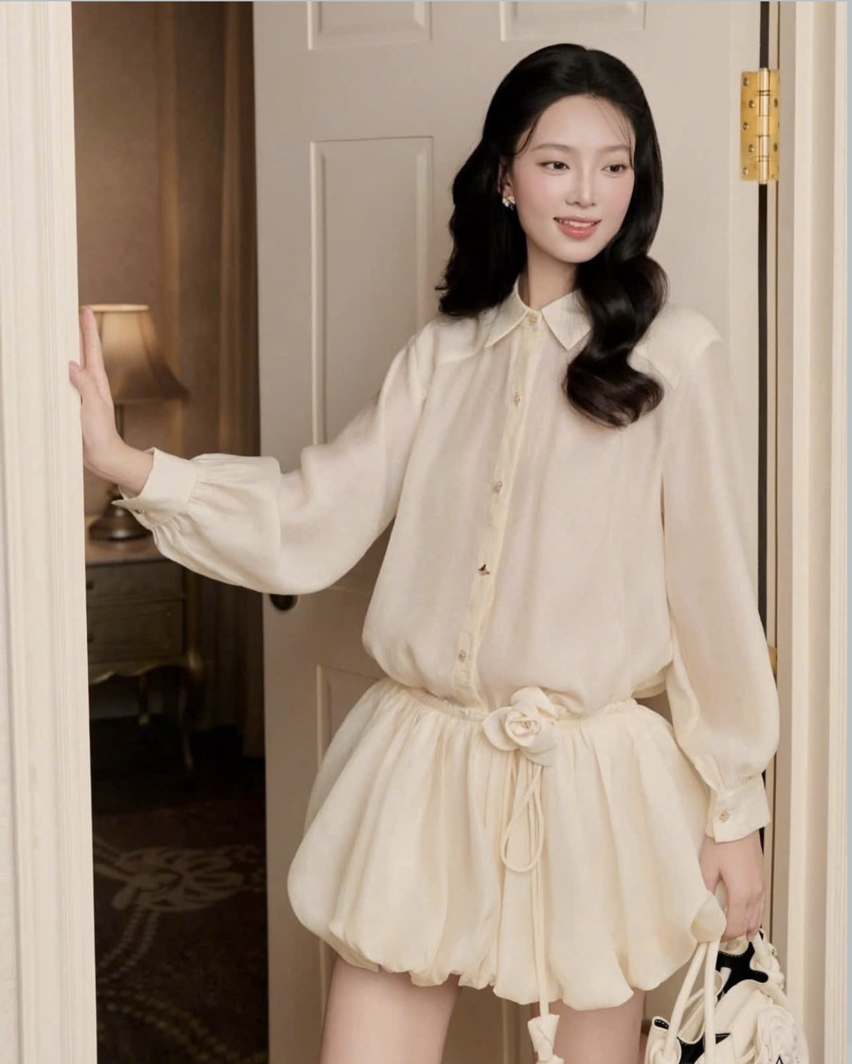 Cuối cùng là set váy đũi màu kem sữa dáng babydoll ngọt ngào, chất đũi tơ mềm mịn, tay áo bồng nhẹ và phần váy phồng tự nhiên. ẢNH: @LYKKES.OFC