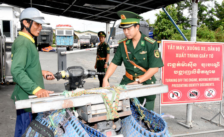 Cán bộ Trạm Biên phòng Cửa khẩu quốc tế Tịnh Biên kiểm tra phương tiện nhập cảnh. Ảnh: KIỀU DIỄM