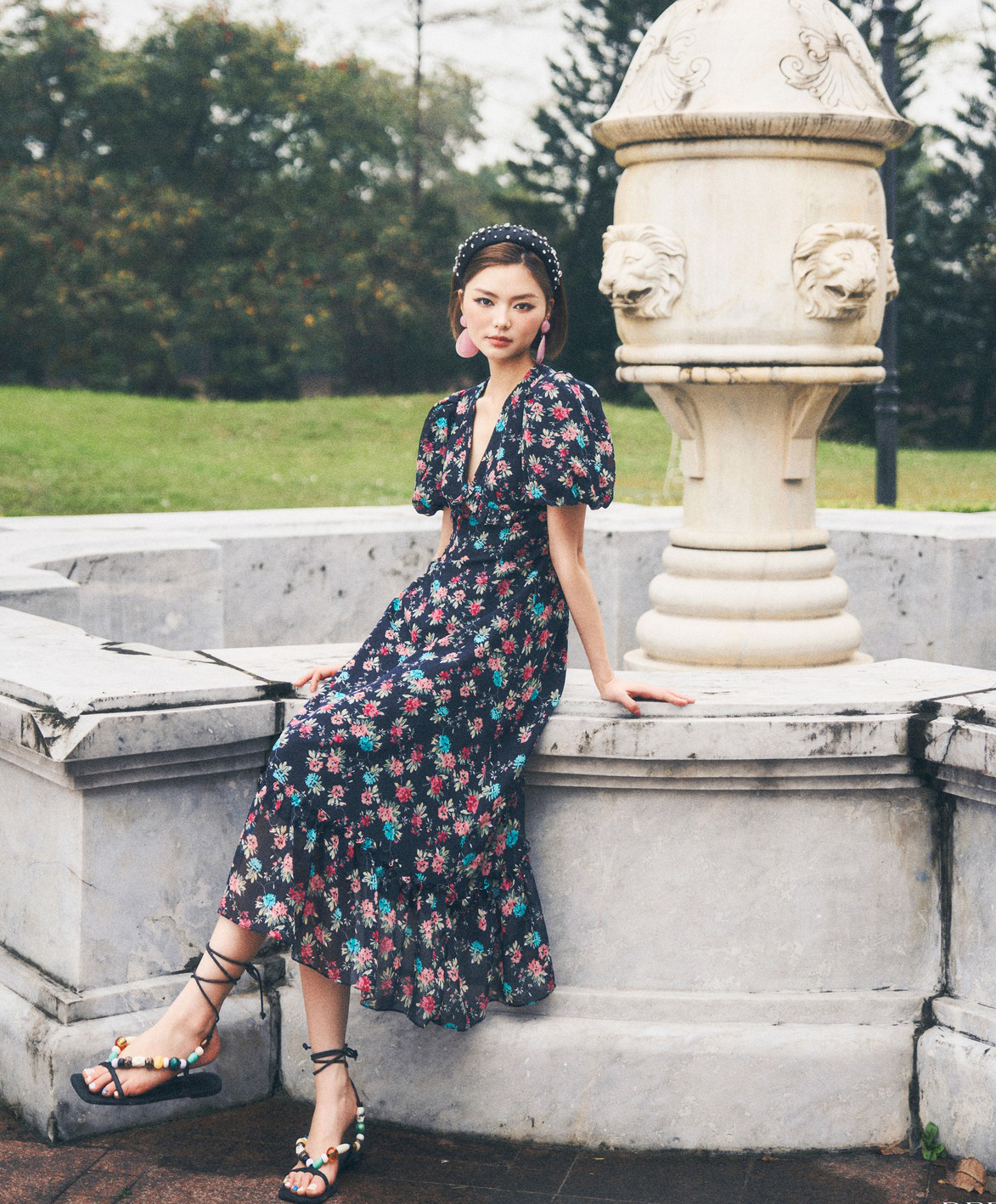 Đầm maxi tay bồng phối xăng đan dây xâu chuỗi hạt đá màu tạo nên tổng thể vừa kiêu kỳ vừa ấn tượng. Họa tiết hoa đa sắc trên nền xanh đen hoàn hảo để che khuyết điểm, chất vải voan mỏng thoáng mát, nhẹ nhàng nhưng vẫn đủ tinh tế để nàng ghi điểm trong mắt người thương. ẢNH: DREAMERS