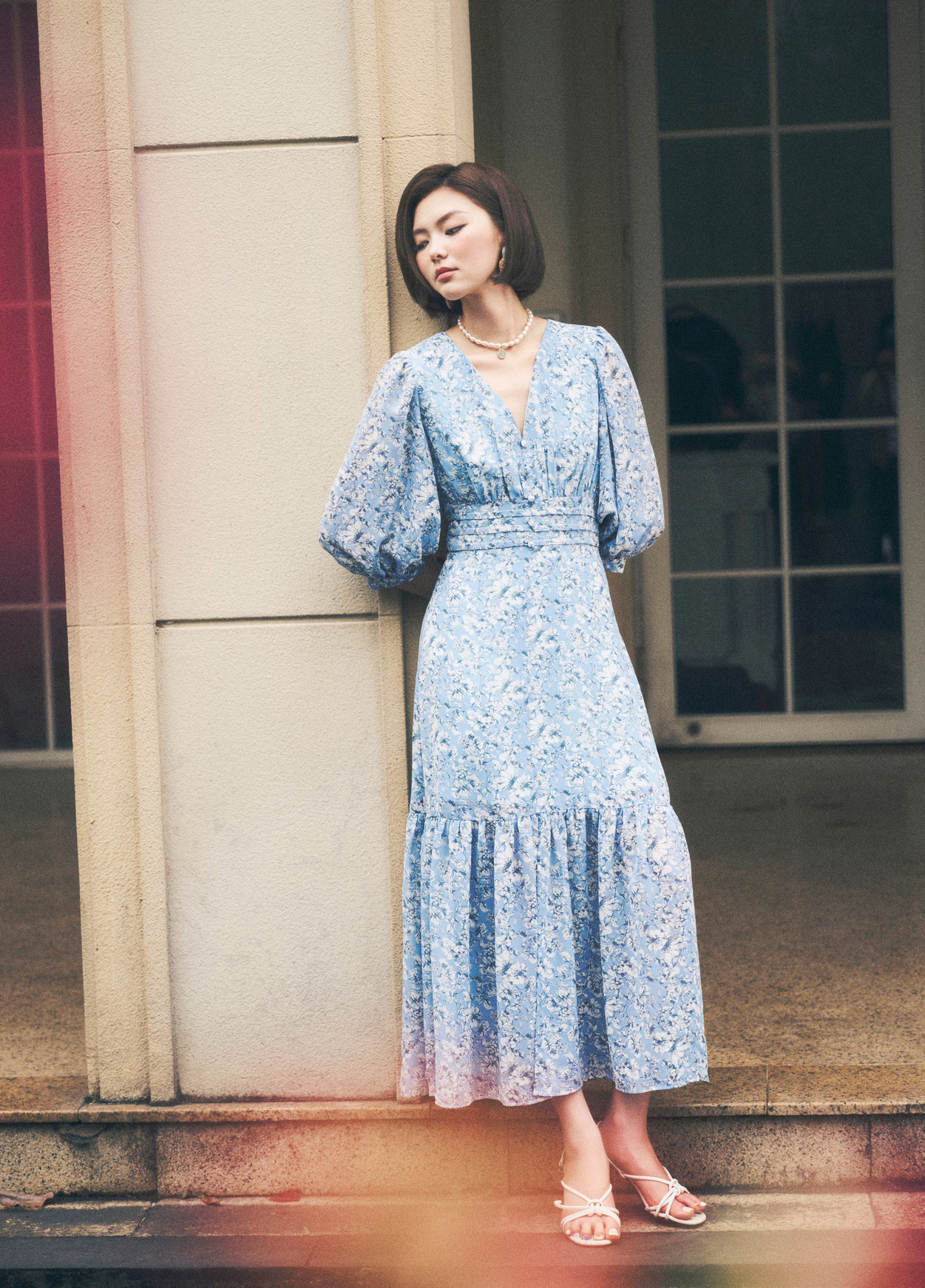 Chạm vào vẻ đẹp lãng mạn và nên thơ của những chiếc váy dài in hoa qua bản phối họa tiết màu xanh dương. Cổ áo chữ V phối vòng cổ tròn tôn trọn gương mặt, mái tóc ngắn và xăng đan cao gót bổ sung vào vẻ ngoài ấn tượng. ẢNH: DREAMERS